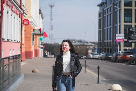 Street style of a young woman in her 20s. Caucasian female 25 years old is walking along the avenue of the European city in the downtown. Slim white girl in denim shorts and a jacket walks outdoors.