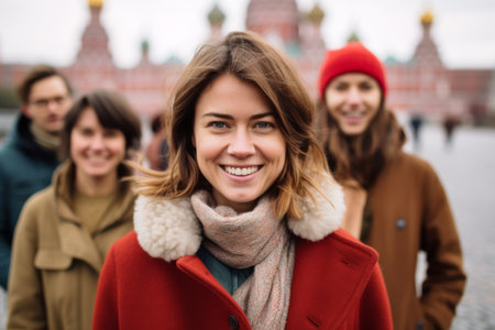 Portrait of a beautiful young woman with friends on the background of the Moscow Kremlin