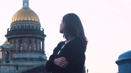 Side view of tourist woman looking far in the distance. Media. Young female traveler in casual outfit visiting historic building Saint Isaac Cathedral during summer holidays, St. Petersburg, Russia.