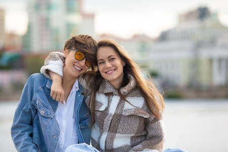 Lesbian couple sit on the embankment and looking at camera - they enjoy each other during outdoor walking.