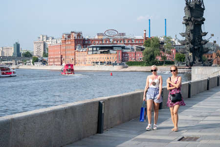 Moscow. Russia. June 26, 2021. Two young girls in light clothes and sunglasses walk along the river embankment on a sunny summer day. In the background, pleasure ships float on water.
