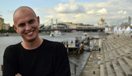 Portrait of a young man in profile outdoors. Acne skin. In a blur in the background, the river, forest and buildings.