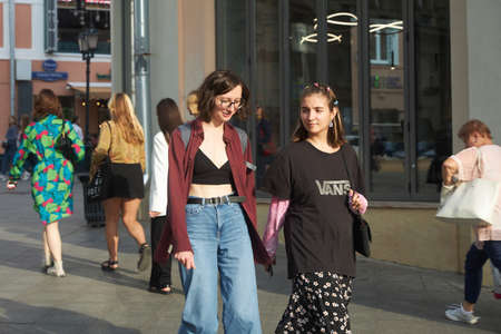 MOSCOW, RUSSIA - APRIL, 29, 2017. Crowded pedestrian road and young people hanging out