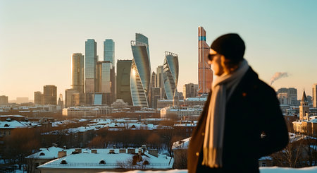 Businessman looking at skyscrapers of Moscow city at sunset.
