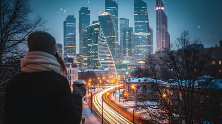 Stylish redhead hipster girl with tattoo on her face wearing denim coat holding takeaway coffee sitting in front of skyscrapers in Moskow city at cloudy morning.