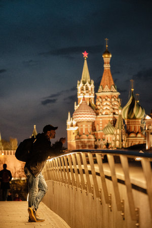 MOSCOW, RUSSIA - APRIL 17 2021: A man takes pictures on a smartphone in the evening in Zaryadye park