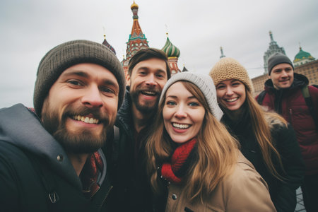 Joyful group of tourists takes a selfie with saint basils cathedral in the background