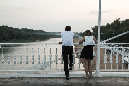 Orenburg, Russia - August 03, 2016: Loving couple near fence in the summer park