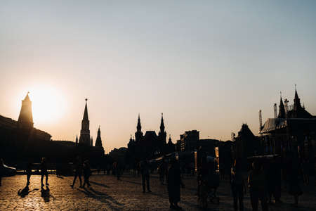 June 6, 2019. Red Square, Moscow, Russia. Kremlin towers and tourists on Red Square at sunset in Moscow.