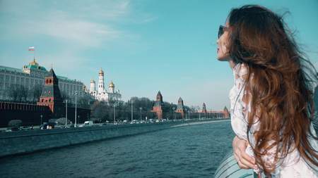 Beautiful brunette woman watching at Moscow Kremlin. Travel to Russia concept