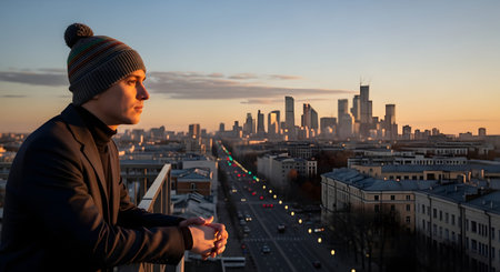 A young man wearing a beanie and blazer leans on a balcony railing, gazing at a modern city skyline during a golden sunset. The image conveys a sense of contemplation, urban lifestyle, and appreciation of the cityscape.