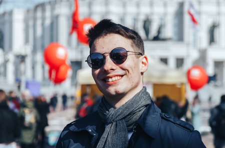 Minsk, Belarus. March 25, 2018 A holiday dedicated to the 100th anniversary of the founding of the Belarusian People's Republic A man stands on a background of red balls