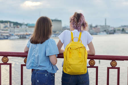 Portrait of two teenage girls standing with their backs on bridge over river, girls friends enjoying sunset on water surface, talking, relaxing. Friendship, lifestyle, youth, teens