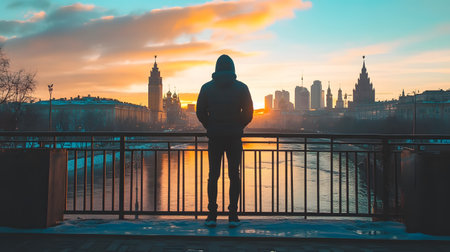 A contemplative figure gazes over a city skyline during a vibrant sunset, capturing a moment of tranquility and reflection.