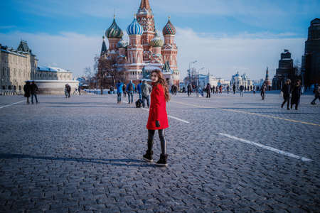 Happy women walking in red coat at the red square in Moscow. Cold time between winter and spring, frost and sun