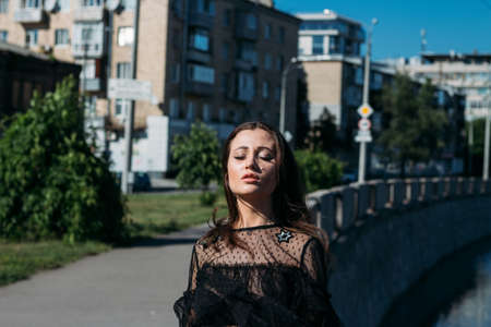 beautiful girl, brunette, in the summer by the river in the city, in a black dress. standing alone by the river, on the bridge, the sun is shining in the face, closed her eyes, rest and tourism.