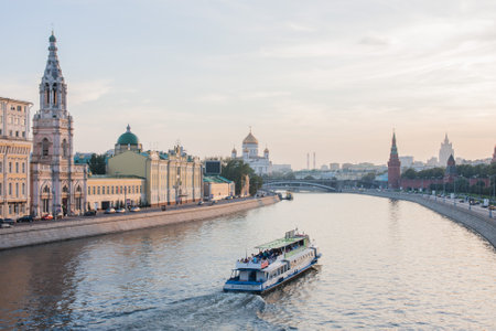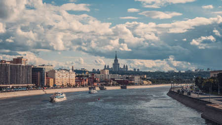 White ship on the Moscow river in the evening.Tourism within the country concept. Beautiful views of Moscow on the Sparrow hills.