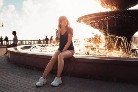 A pretty young woman with a tattoo on her arm is sitting by the fountain. Sunset in the background. Concept of waiting.