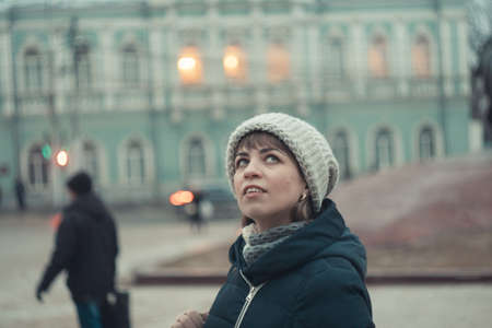 a girl in a winter hat walks around the city