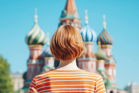 A young woman with short, vibrant hair stands in front of St Basil s Cathedral, showcasing the colorful domes, encapsulating a sense of wonder and exploration