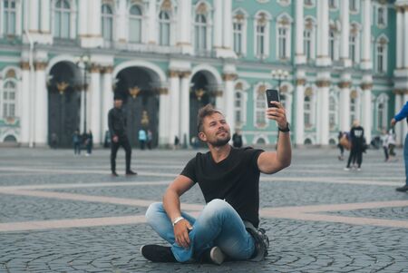 Selfie smiling young man in St. Petersburg, Russia. Portrait of a beautiful man on the background of the Hermitage. Happy tourist in town