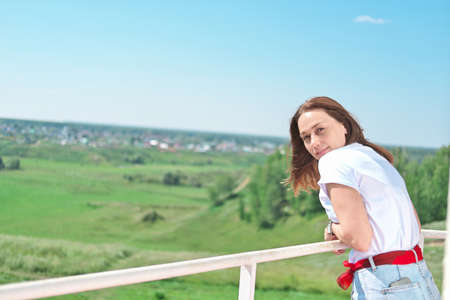 happy attractive woman looking over the shoulder and thinking. middle age woman standing on a terrace of a house on a hill and enjoing beautiful landscape. relaxation and holidays concept.