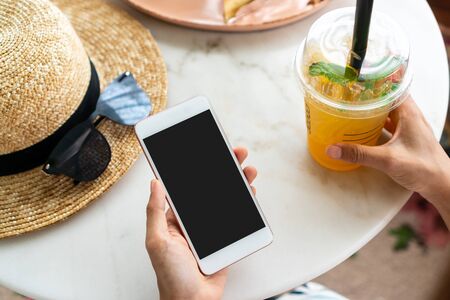 Close up of women's hands holding mobile phone in cafe.