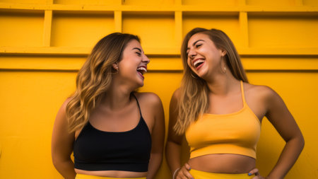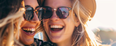 Two beautiful best friends laughing together wearing sunglasses and straw hat, having fun in summer vacation
