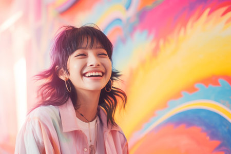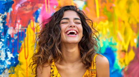 A woman laughs with eyes closed against a bright backdrop. Her long hair flows. The background features a blurred, colorful design, with blue, yellow, and pink hues. The image has a natural lighting. Suitable for various editorial and commercial applications.