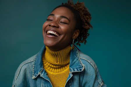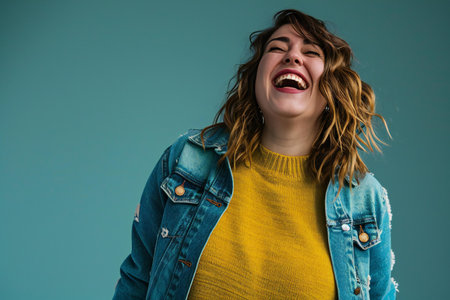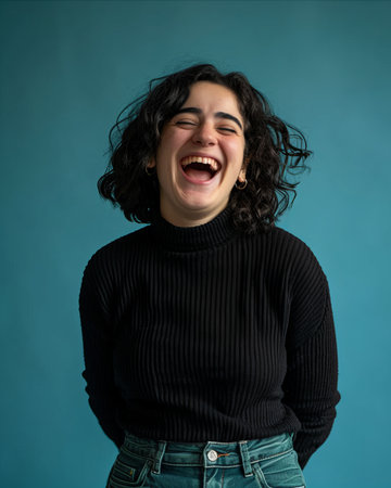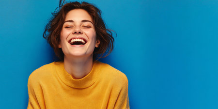 Radiant Joy Unleashes Genuine Laughter in a Bright Blue Studio Space, Creating Authentic Happiness