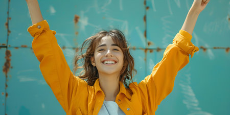 Outdoor portrait of smiling teen girl with arms raised up, gray sunny wall background, emotion of happiness and joy.