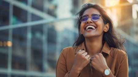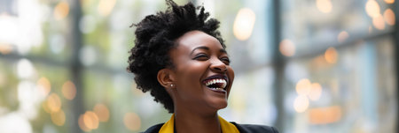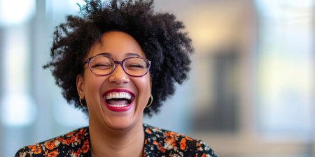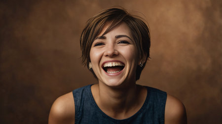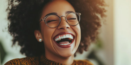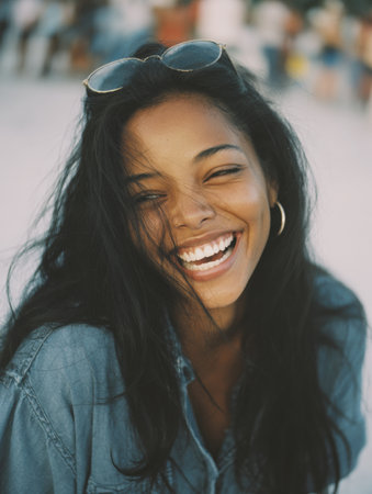 A woman laughs with genuine joy in an outdoor setting. The image showcases natural skin tones and a soft, blurred background with warm lighting. This portrait style photograph could be used for various commercial or editorial purposes, promoting positive emotions and everyday life.