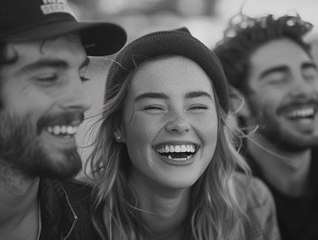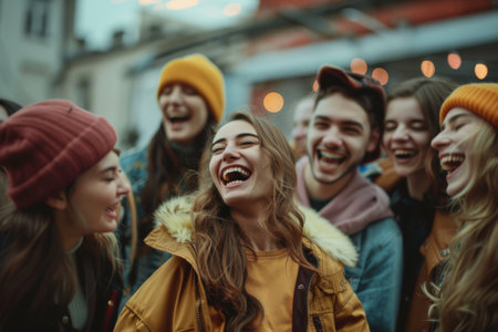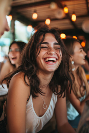 A woman in a moment of candid laughter with friends, her face expressing genuine amusement and joy, the bond of friendship enriching the scene.