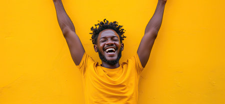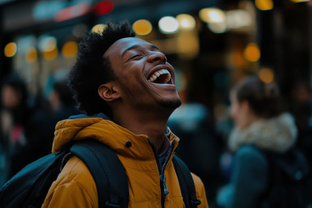 Capture pure exuberant joy with this candid portrait of a young Black man laughing heartily in a vibrant yellow hoodie amid a bustling city night crowd. Ideal for lifestyle ads, diversity campaigns, emotional wellness content, and urban youth marketing to evoke happiness and connection. Perfect hero image for social media, blogs, and motivational posters highlighting authentic emotions.