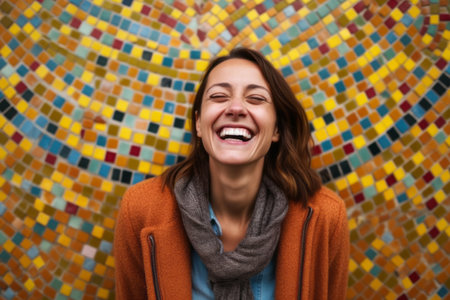 Portrait of a smiling young woman laughing against colorful mosaic wall background