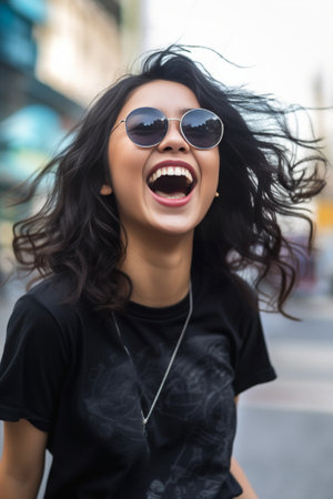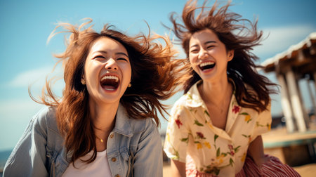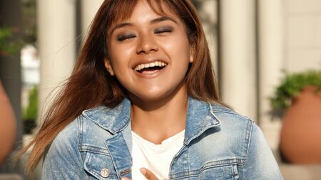Generative AI : Portrait of happy young asian girl smilelaugh with big teeth and lips in outdoor background with sunlight and copy spaceBeauty blockerstylish fashion model in curly