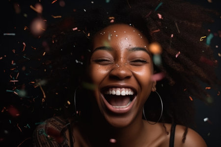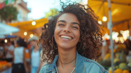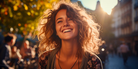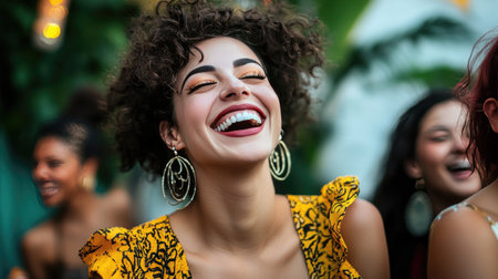 A joyful woman with curly hair is laughing in a vibrant outdoor setting, surrounded by friends, capturing the essence of happiness and celebration.