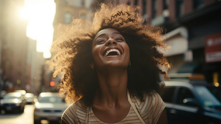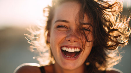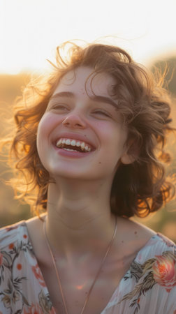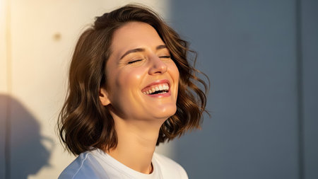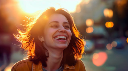 A woman is shown laughing, her eyes closed, illuminated by sunlight. The portrait exhibits warm tones and soft textures, highlighting a joyous expression. The composition features a shallow depth of field, suggesting an outdoor setting. Suitable for various uses, this image could be employed in commercial and editorial contexts.