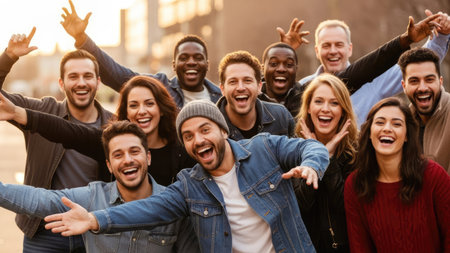 A group of diverse individuals smiles and laughs joyfully, arms raised in celebration. The composition features a shallow depth of field, with soft, natural lighting. The image suggests a sense of camaraderie, perfect for commercial projects highlighting unity and positive emotions. It