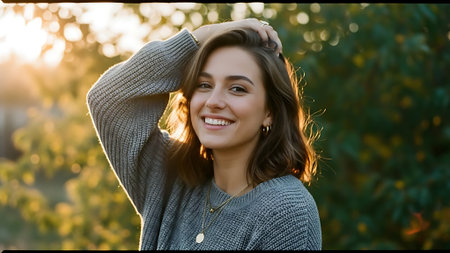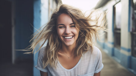 A joyful woman radiates happiness as she stands outdoors under the sunlight. Her flowing hair dances in the breeze, capturing a moment of pure delight.