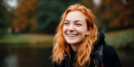 A young woman with bright red hair smiles broadly while looking off to the side. She is wearing a black fuzzy jacket and has a backpack on. The background is blurred with autumn foliage and a body of water.