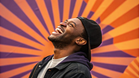 A man in midlaugh with his eyes squinted and raised in pure happiness. His background features a burst of vibrant oranges and purples creating an energetic atmosphere that mirrors.