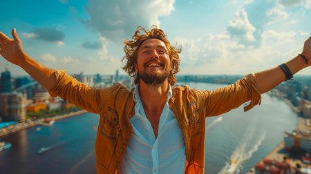 Young man with arms outstretched enjoying on the background of a panoramic city.