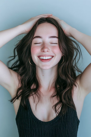 Cheerful young woman with natural freckles and wavy hair, smiling with closed eyes. Relaxed pose conveys happiness, confidence, and authentic beauty.