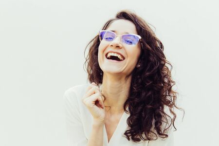 Happy stylish woman in glasses laughing at camera with open mouth. Wavy haired young woman in casual shirt standing isolated over white background. Positive emotion or joy concept