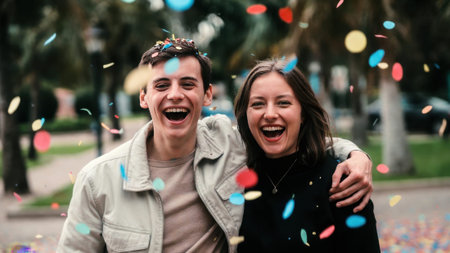 Cheerful young caucasian couple celebrating with confetti outdoors.