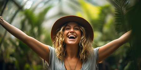 Adventurous woman joyfully exploring the lush wonders of a tropical jungle. Concept Travel, Adventure, Nature, Exploration, Jungle