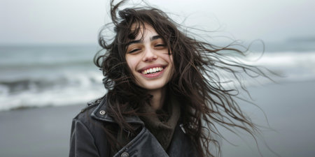 A young woman with long, dark hair stands on a beach, her smile illuminated by the wind whipping through her hair.