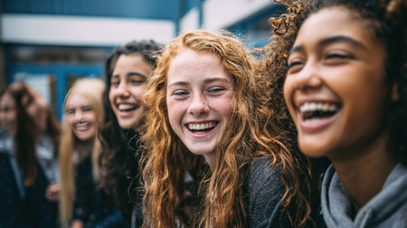 Teen girls laugh and chat outside school, candid moment, multicultural and casual energy