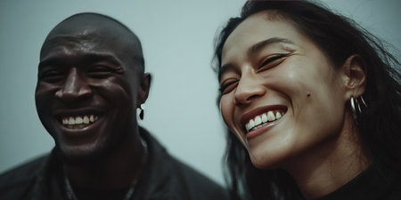 A black man and an Asian woman share a joyful moment smiling widely. The setting highlights their happiness with an emphasis on diversity and family unity.